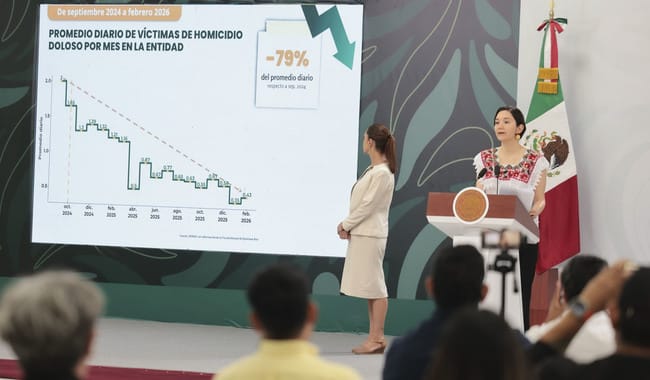 La titular del Secretariado Ejecutivo del Sistema Nacional de Seguridad Pública, Marcela Figueroa Franco, explicó que febrero de 2026 fue el más bajo desde 2016, al pasar de un promedio de 1.2 a 0.4 víctimas diarias, de febrero de 2025 a febrero de 2026, lo que representa una reducción del 68 por ciento. Informó que los delitos de alto impacto también presentaron una tendencia a la baja, con una reducción del 36 por ciento respecto a octubre de 2024, pasando de un promedio diario de 9.16 a 5.89 en febrero de 2026.