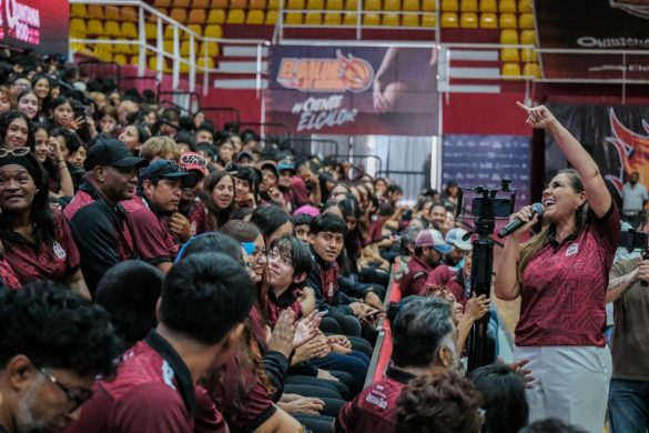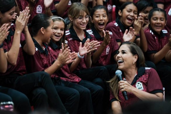 “Chavas y chavos, estamos bien orgullosas y orgullosos de ustedes, desde dos grandes personajes que están aquí, Jazziel y Shaday, hasta los que están allá arriba. Quiero agradecer a los papás, mamás, que a lo largo de este año les han acompañado, que les lavan los uniformes, que están al pendiente de lo que necesitan, que lloran cuando pierden y que los abrazan y les dicen que van para adelante cuando ganan”, destacó la Gobernadora tras entregar el banderín del Escudo de Quintana Roo, teniendo como escenario el Poliforum Cancún.